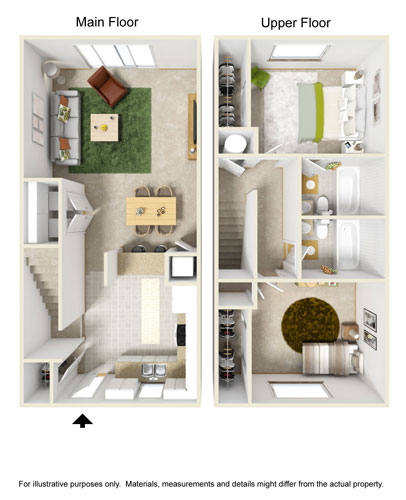 Located tucked away from the busyness of the city, these 1052 sq. ft. to 1152 sq. ft. two level, two bedroom, two bath townhomes in Columbia, MO have a homey feeling with their roomy floorplan. Big windows and an open first level provide a light and spacious living area.